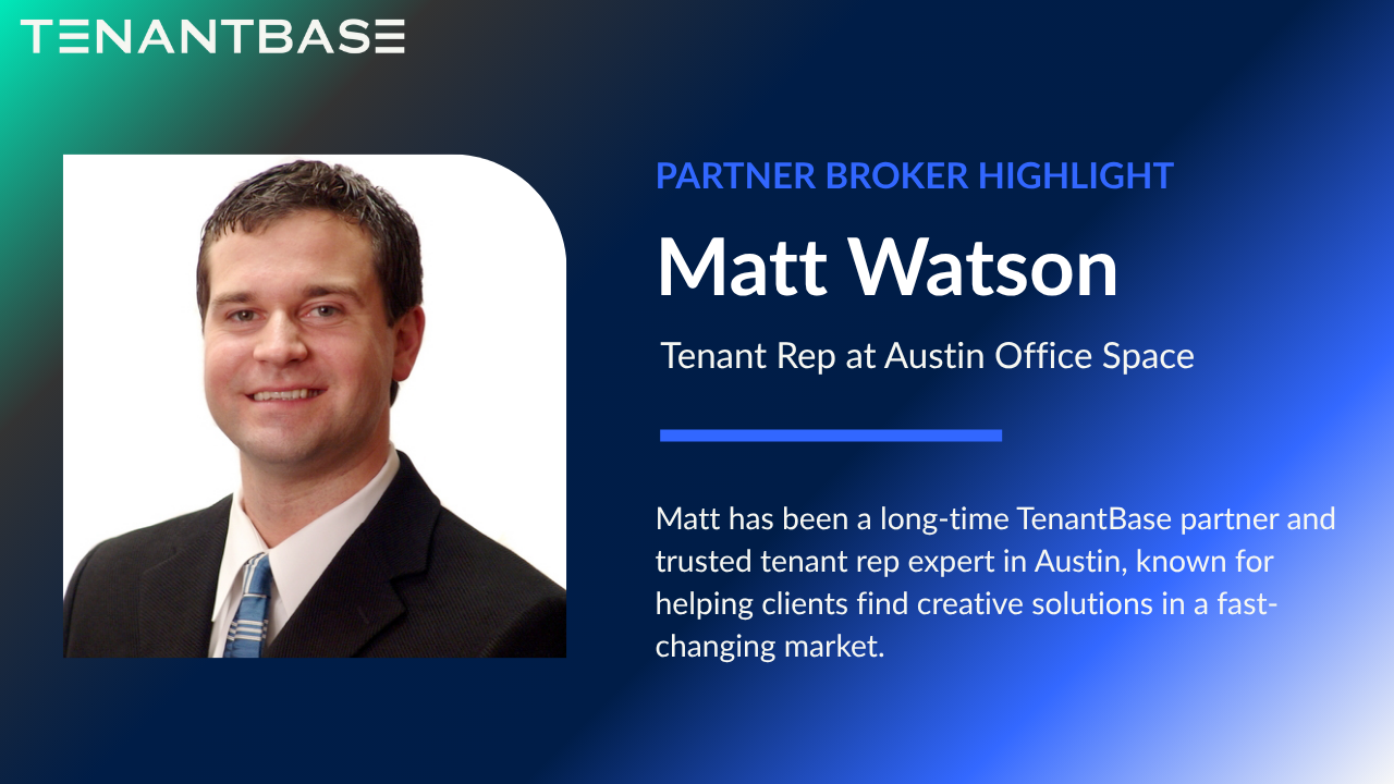 In this Partner Broker Highlight, TenantBase sat down with Matt Watson, Tenant Representative at Austin Office Space, Inc., to talk about his 25-year journey in commercial real estate, the lessons learned along the way, and how he’s continued to adapt in a changing Austin tenant representation market.