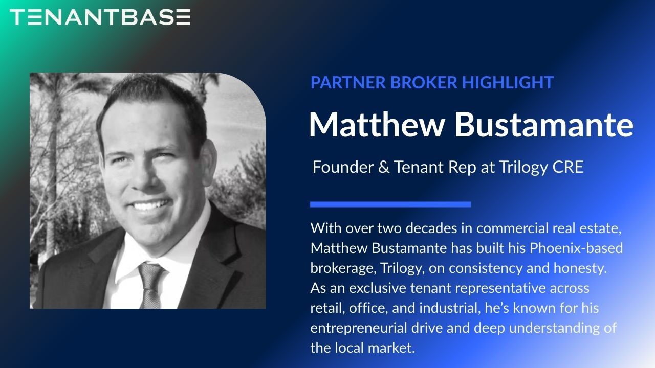 In this Partner Broker Highlight, TenantBase sat down with Matthew Bustamante, Founder of Trilogy CRE, to talk about his path from commercial insurance to exclusive tenant representation across retail, office, and industrial. Matthew shares how a volume-first mindset, diversification, and relentless consistency help his team win in one of the country’s fastest-growing markets.