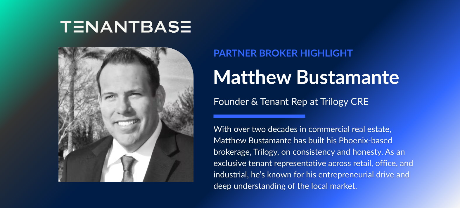 Our thanks to Matthew Bustamante for sharing his story and for his continued partnership with TenantBase. Brokers like Matthew — entrepreneurial, honest, and relentlessly consistent — show what effective tenant representation looks like in Phoenix and beyond.