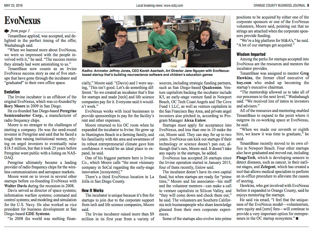 Did you catch the EvoNexus article, "Incubator Unique Add to Startup Ecosystem," in the OC Business Journal yesterday? We were thrilled to be featured in the piece which included TenantBase’s recent graduation from Irvine business incubator EvoNexus to new headquarters in Newport Beach, CA.