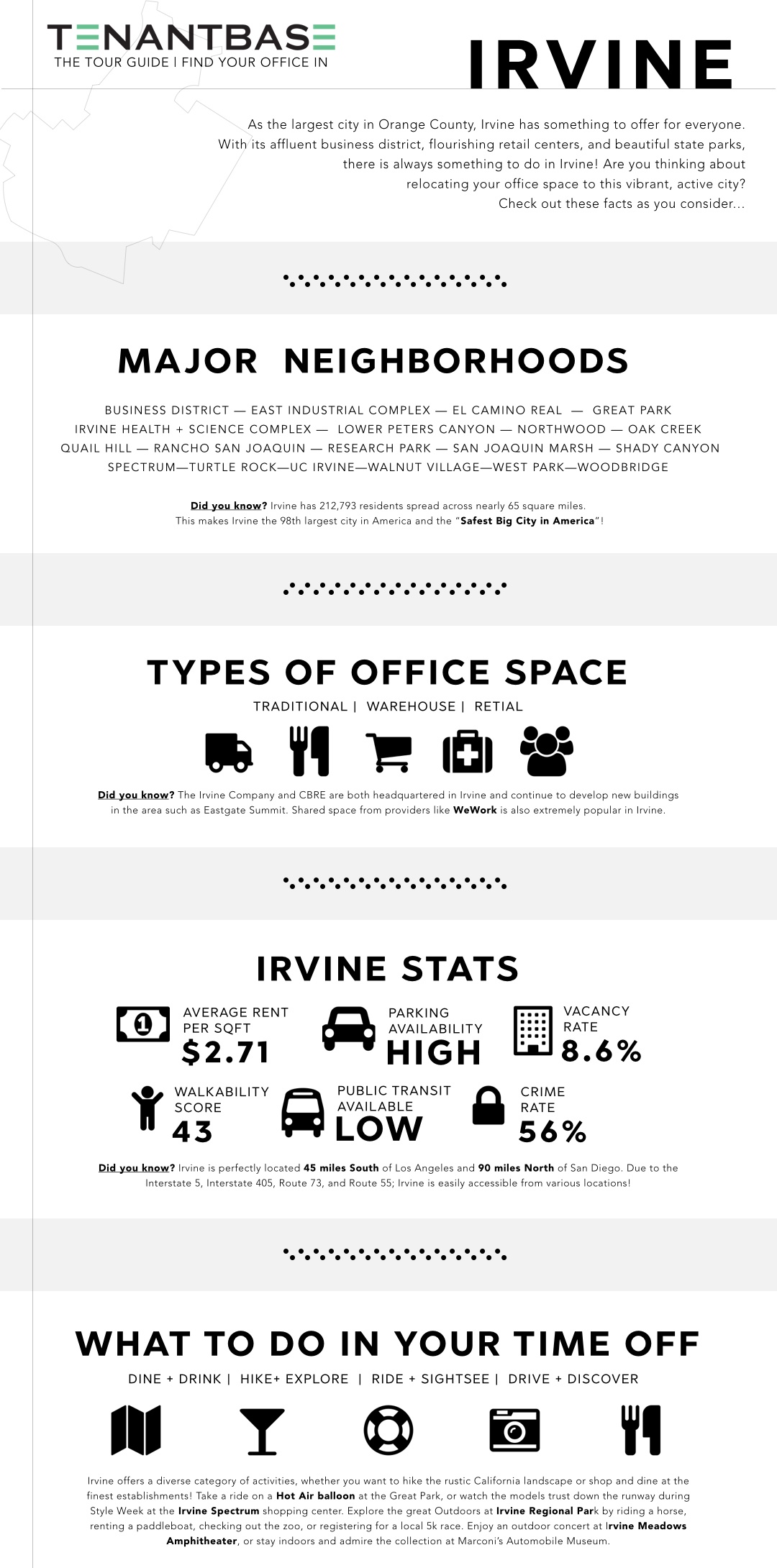 Next up, Irvine! If this bustling business hub is your next step -- don't forget to reach out to TenantBase to help you find Irvine office space.